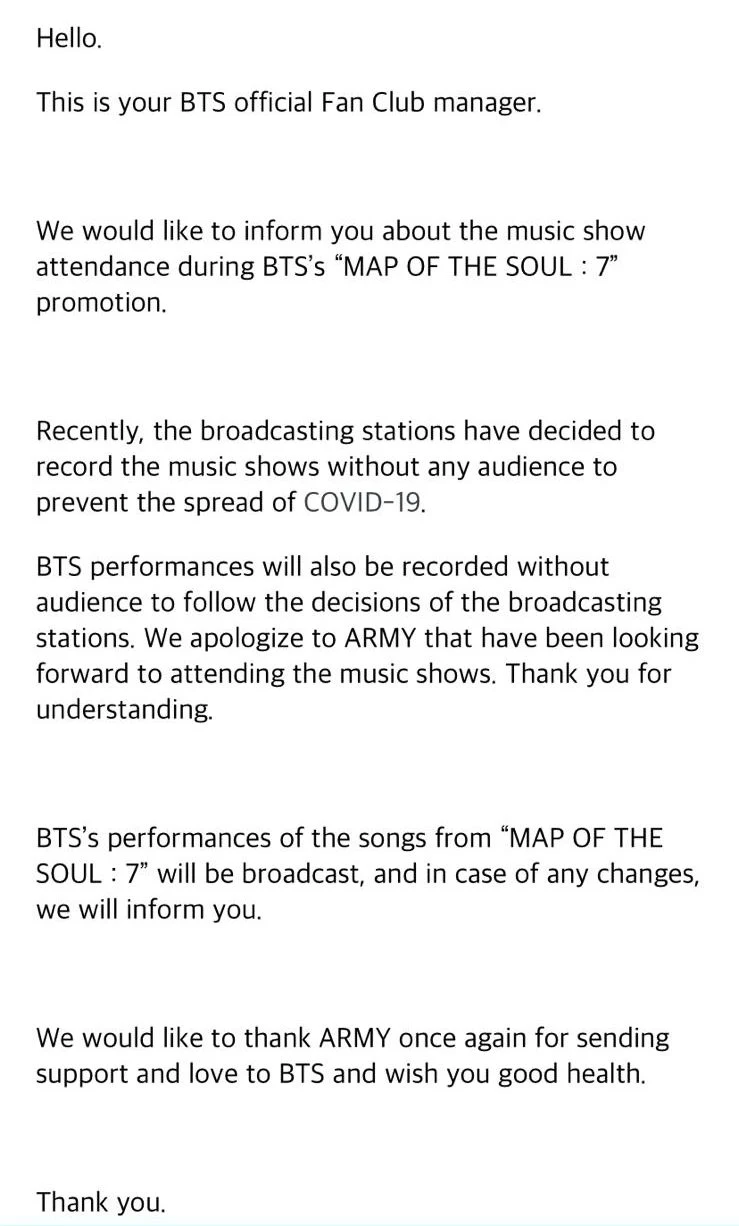 As performances do BTS também serão gravadas sem audiência para seguir a decisão das emissoras. Pedimos desculpas ao ARMY que estava ansioso para assistir aos shows de música. Obrigado pela compreensão.